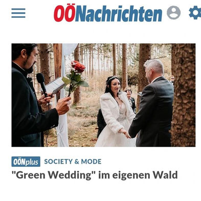Am Beispiel der „Waldhochzeit auf moosgrünen Liebespfaden“ (Fotos: Lisi K. Fotografie) sieht man, wie Gäste zu Fuß an den Hochzeitsort inmitten im Wald gelangen. Es wurde ein Liebesbaum gepflanzt. Statt dem roten Teppich fungierte ein moosgrüner Naturboden - ein Grüne Zeremonie inmitten der Natur. Dank der märchenhaften Eindrücke des Ortes der Freien Trauung, kann der Nachhaltigkeitsgedanke des Brautpaares den Gästen bewusst werden und die Hochzeitsgäste konnten durch die werteorientierten Traurede und die symbolischen Handlungen und Stationen im Wald, am Berg oder am Seeufer nachvollziehen, wieso dem Brautpaar eine grüne Zeremonie inmitten der Natur so wichtig war.